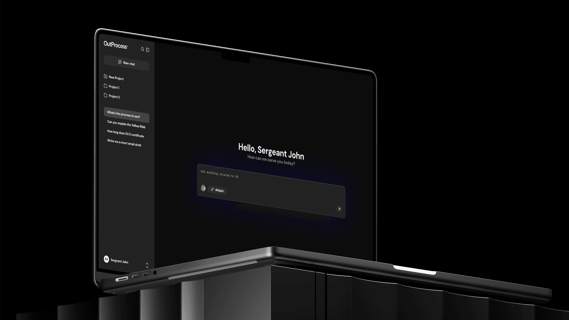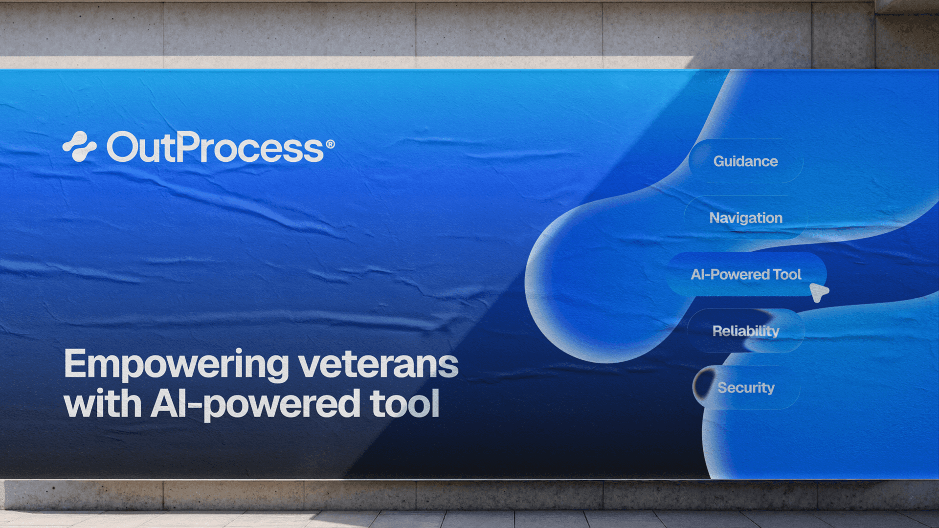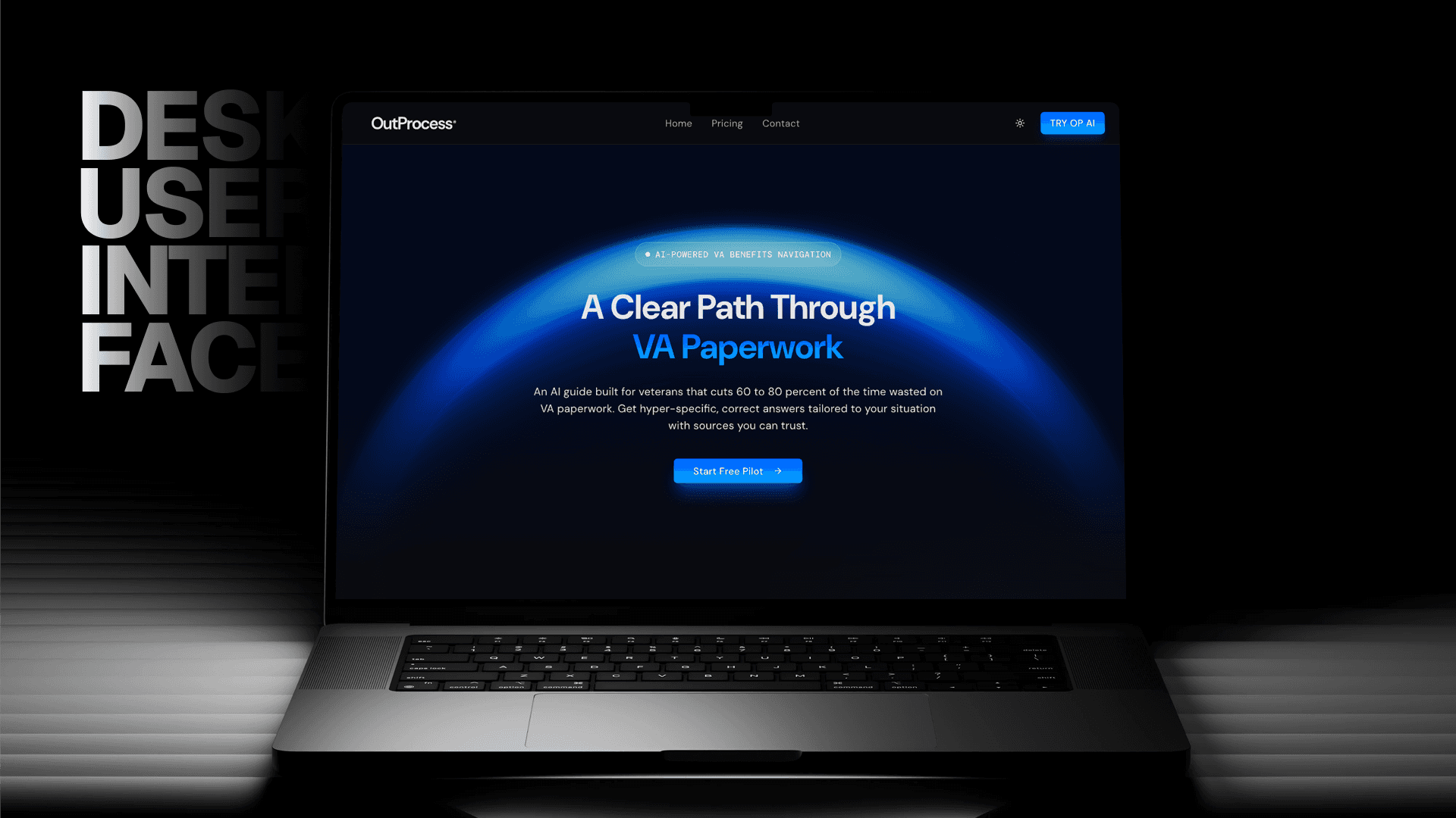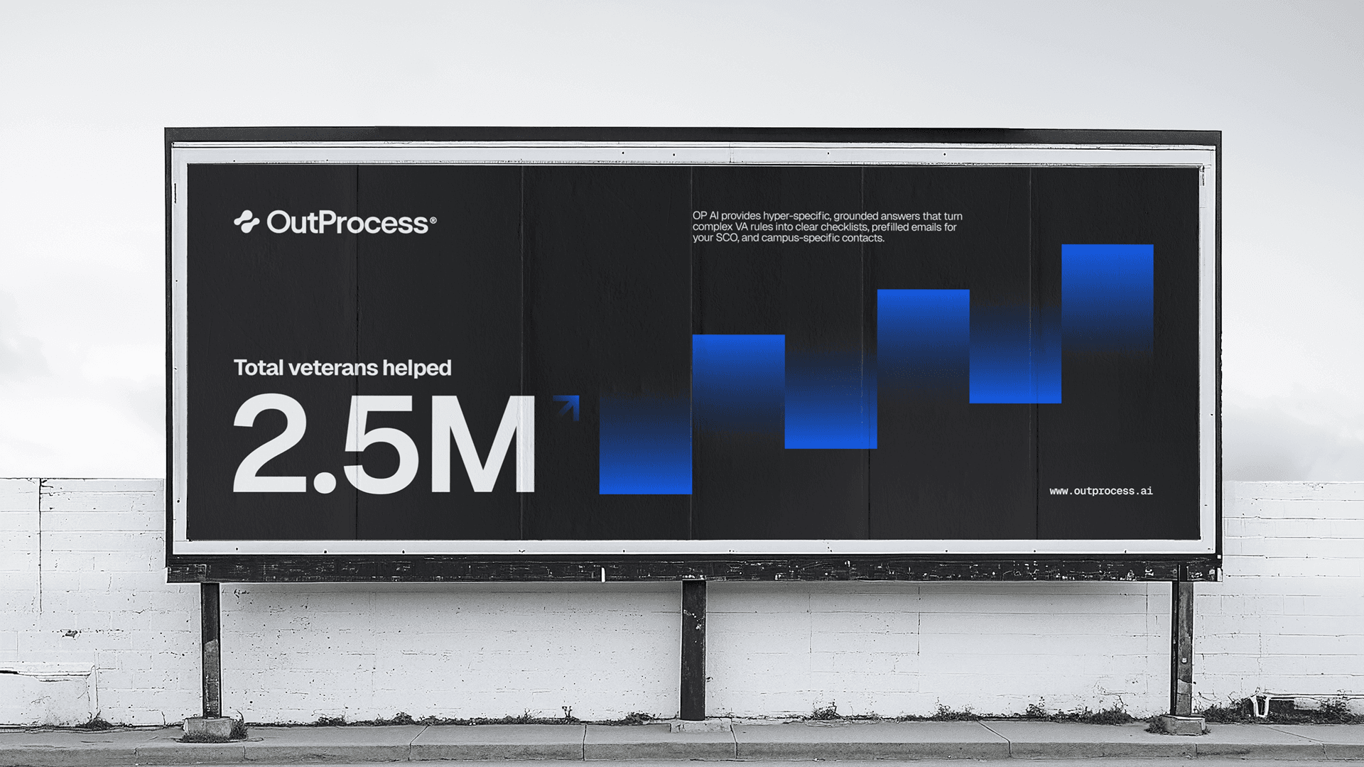Through this collaboration, we developed the brand identity, designed and built the web application, and structured the AI system around verified guidance and real decision points veterans face. OutProcess AI now stands as a clearly positioned product that helps veterans choose between programs such as the GI Bill and VR and E, confirm eligibility like the Yellow Ribbon program, and follow step by step guidance tailored to their situation.