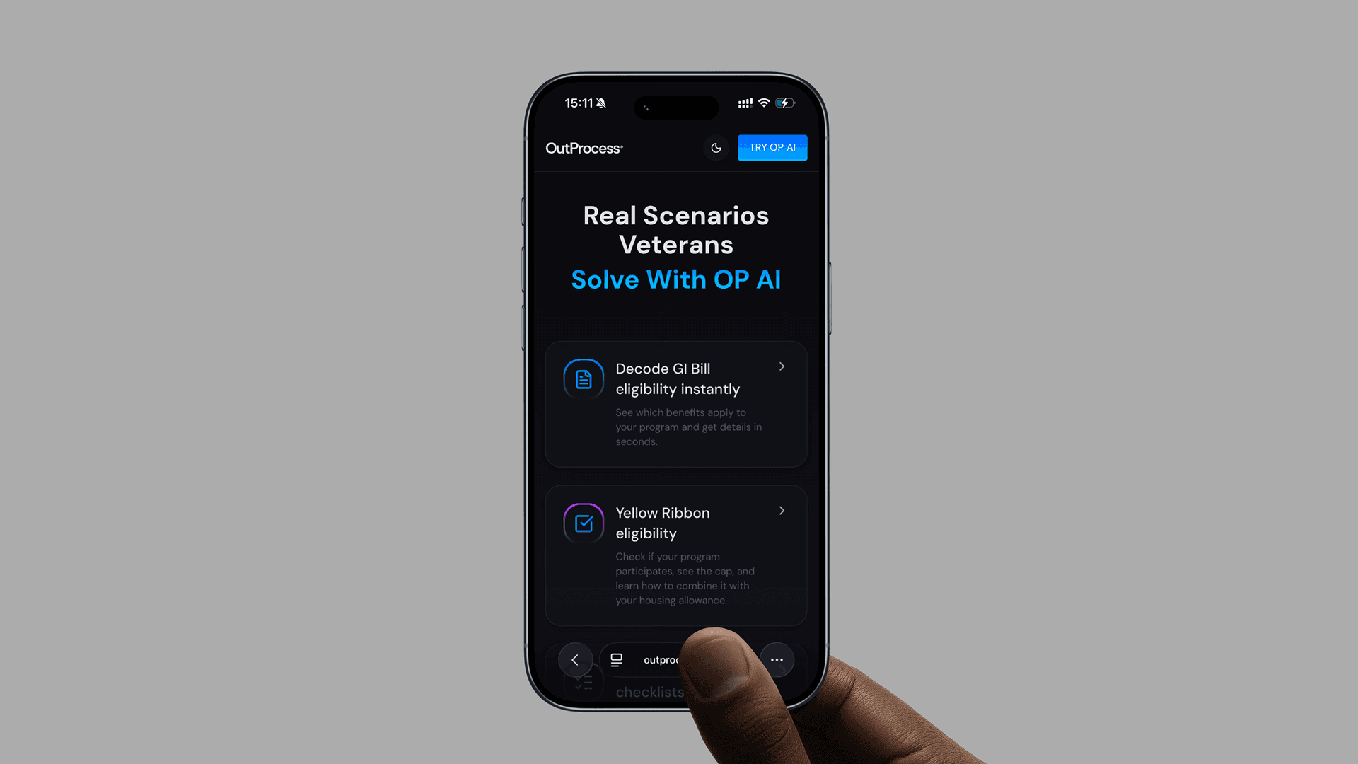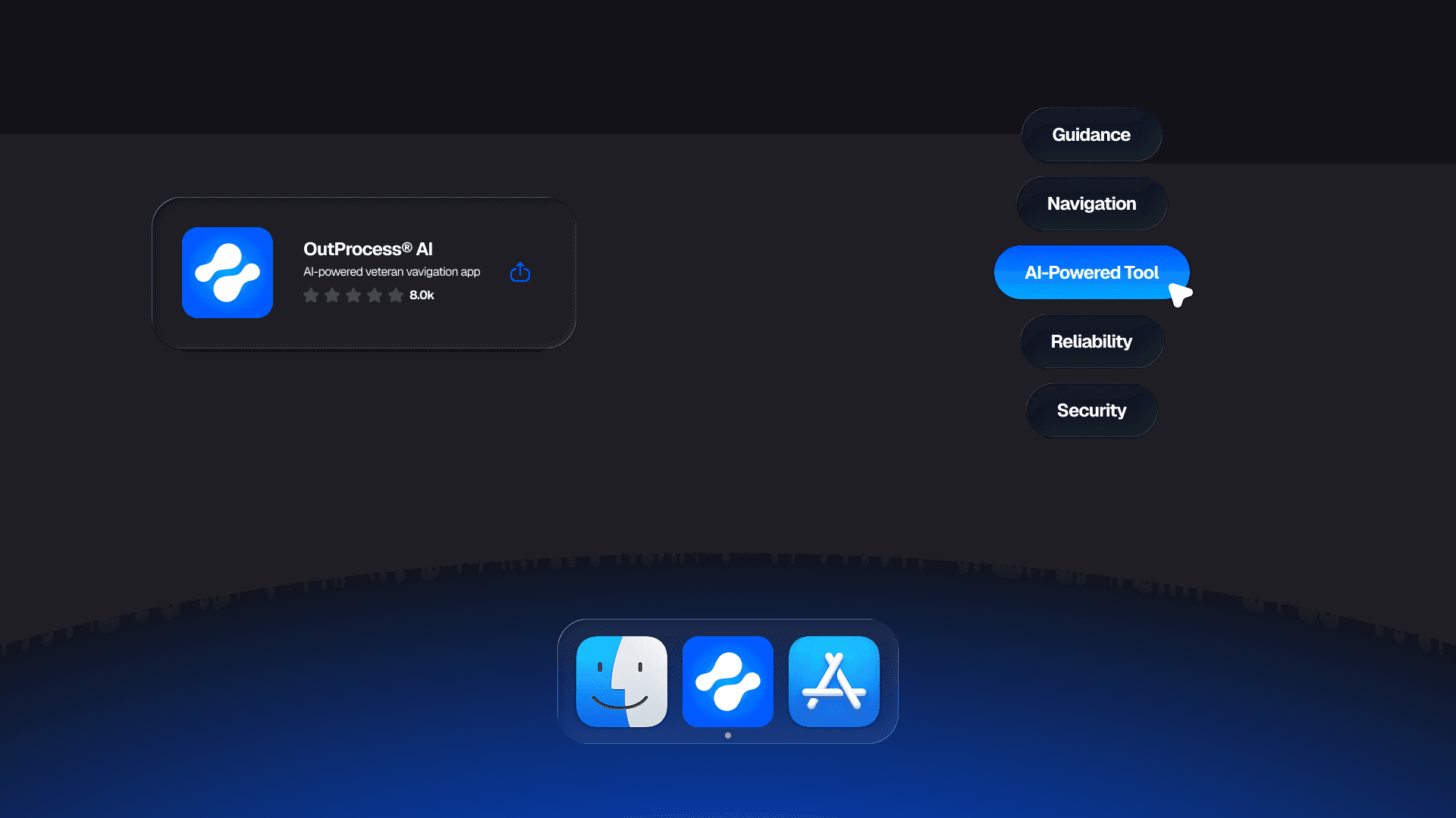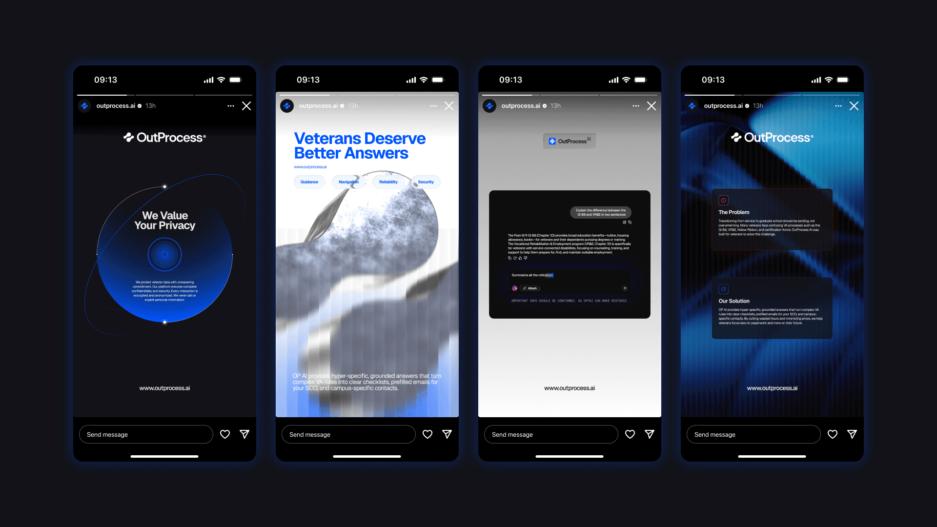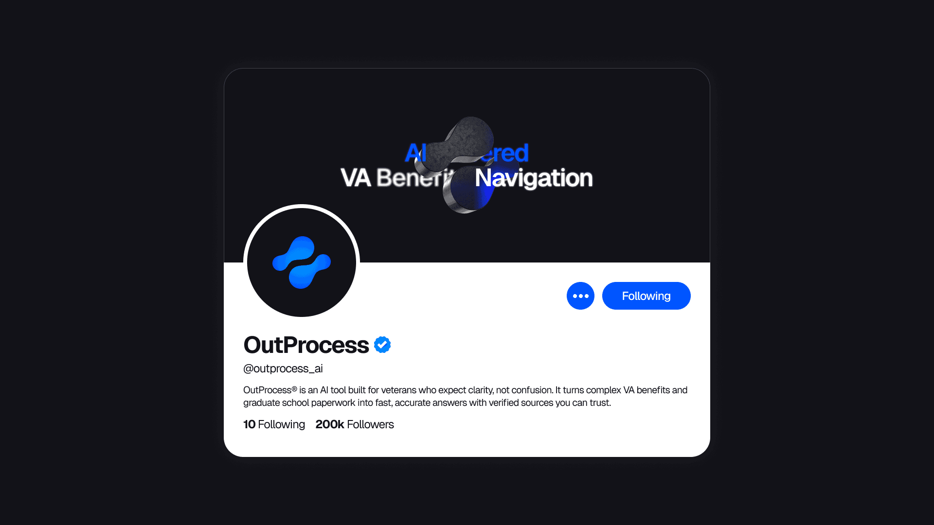 Through this collaboration, we developed the brand identity, designed and built the web application, and structured the AI system around verified guidance and real decision points veterans face. OutProcess AI now stands as a clearly positioned product that helps veterans choose between programs such as the GI Bill and VR and E, confirm eligibility like the Yellow Ribbon program, and follow step by step guidance tailored to their situation.